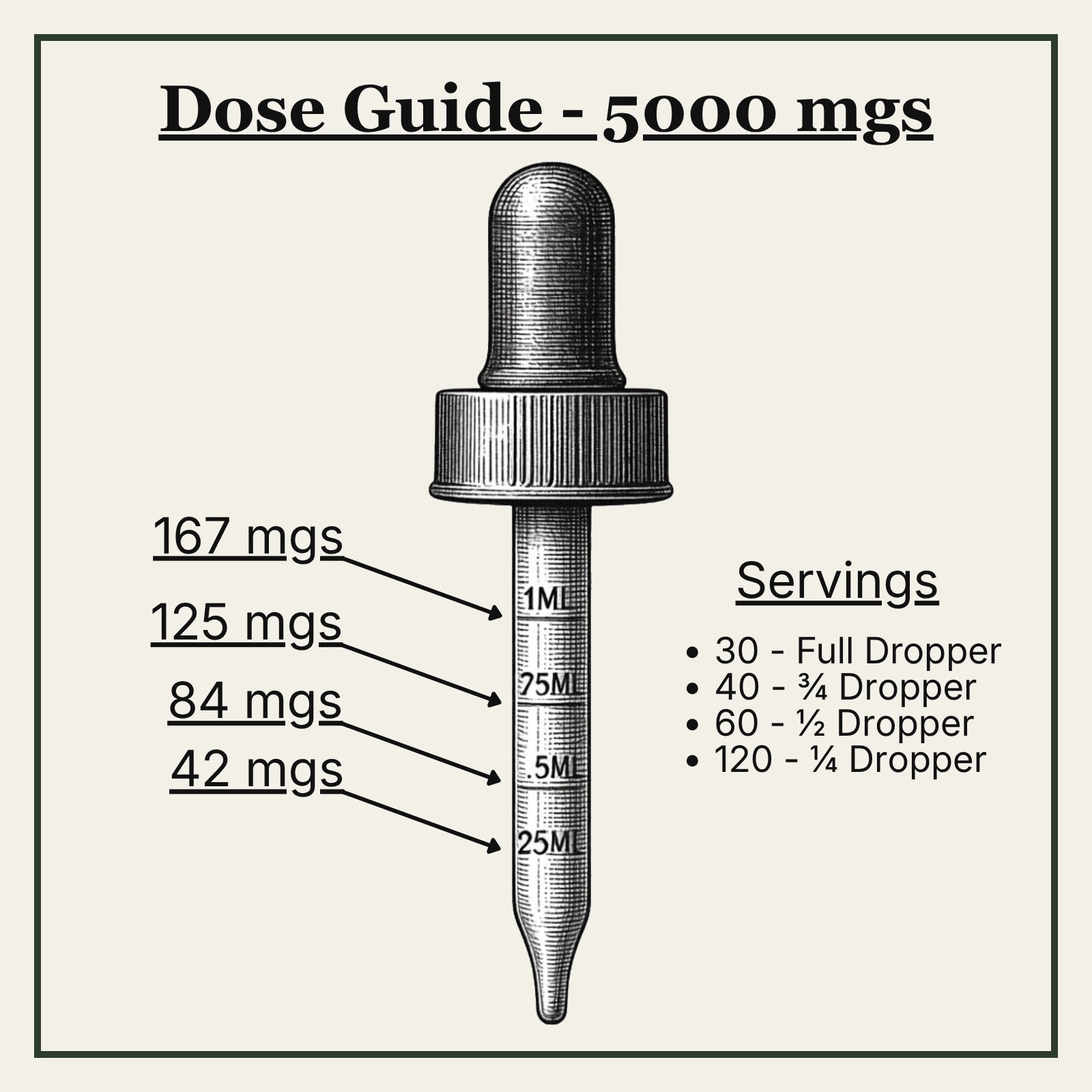 • mgs / mL: 1000 mg: ~33 mg/mL | 2000 mg: ~66mg/mL | 5000 mg: ~166mg/mL